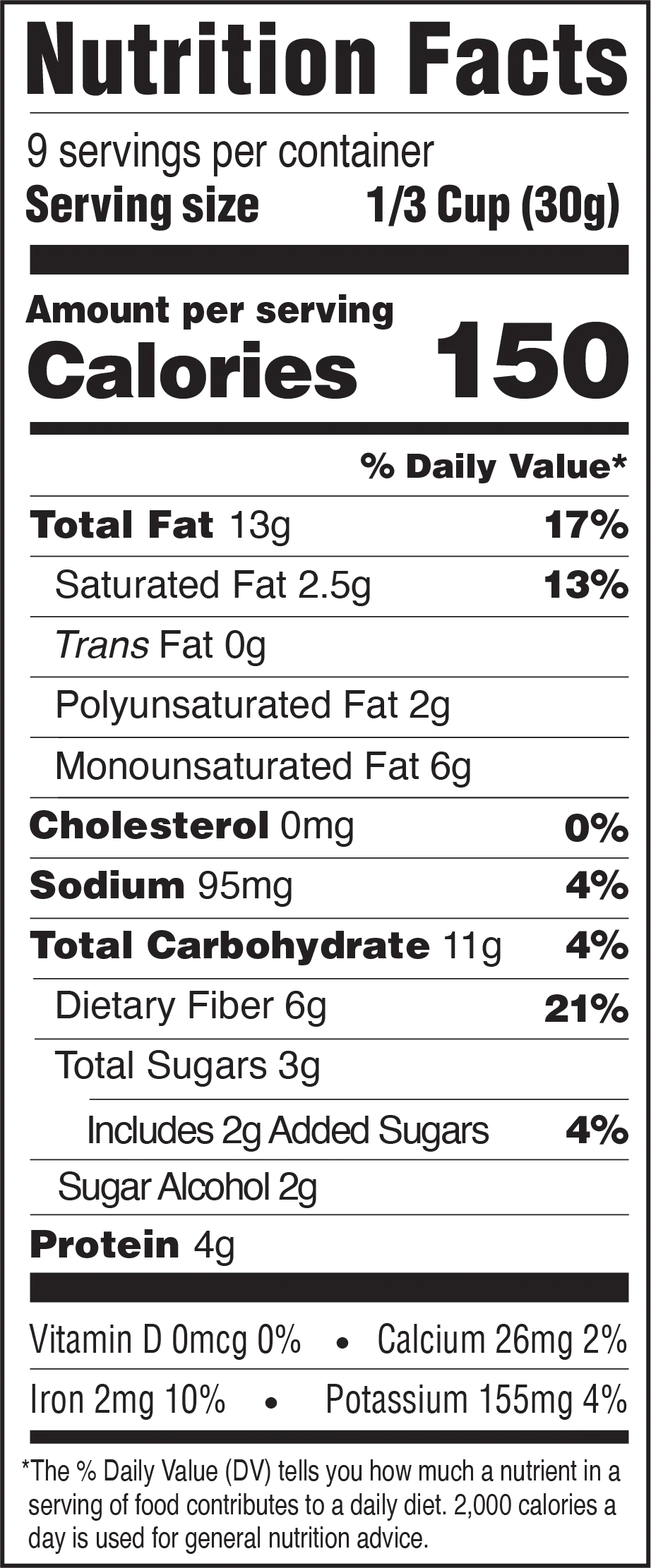 Ingredients: Almonds, Sunflower seeds, Fiber blend (Inulin, Gluten-free oat, Resistant tapioca starch and/or resistant potato starch, Bamboo), Coconut, High oleic sunflower oil, Pumpkin seeds, Coconut palm sugar, Sea salt, Natural flavors, Tocopherols (Vitamin E), Stevia. Contains: Almonds, Coconut, Traces of all other tree nuts.