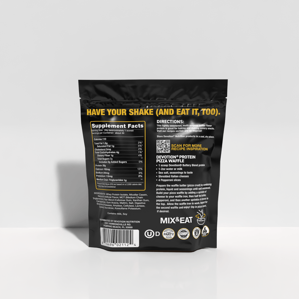 Made with a balanced formula of 80% isolated whey and 20% miscellar casein protein, Devotion Nutrition Original Protein Powder delivers sustained amino acids to your body in a rich, creamy, easy blending formula. Containing six important digestive enzymes and a full gram of MCT (medium chain triglycerides), Devotion Protein Powder is easy on the stomach with no bloating, and no sugar to interfere with maximizing your potential. Enjoy it as a quick drink, an instant ice cream, or in baking. Devotion's unique formula is specifically designed to keep your high protein pancakes, waffles and baked snacks moist and smooth.