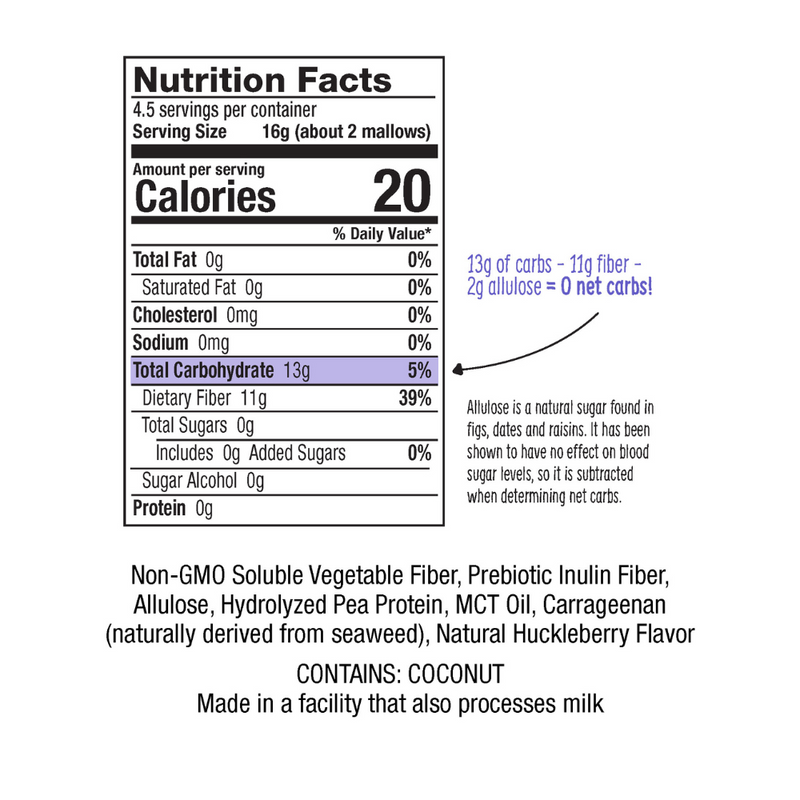 Know Brainer Foods Max Vegan Mallow Sugar Free Marshmallows are fueled with collagen protein, MCT oil and prebiotic fiber. Infused with a touch of flavor, these low carb marshmallows are a great snack and also a terrific addition to your favorite hot beverage. Know Brainer Foods Max Mallow Sugar Free Marshmallows are sweetened with allulose.