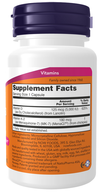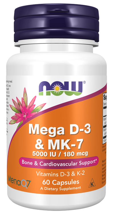 NOW® Mega D-3 & MK-7 combines vitamins D-3 and K-2, two nutrients extensively researched for their roles in the health of bones, teeth and the cardiovascular system.* Vitamin D-3 works with calcium to support bone health, and more recent studies indicate it’s important for immune system health as well.* MenaQ7® MK-7 is a unique soy-free, bioavailable form of vitamin K-2 that plays a critical role in arterial health through its ability to support proper calcium metabolism in blood vessels and arteries.* Vitamin K-2 is also important for the formation of strong, healthy bones.*