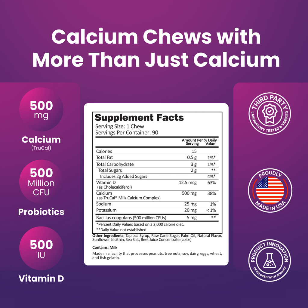 • 500mg Calcium, 500 IU Vitamin D3, 500 million CFU’s probiotics per chew