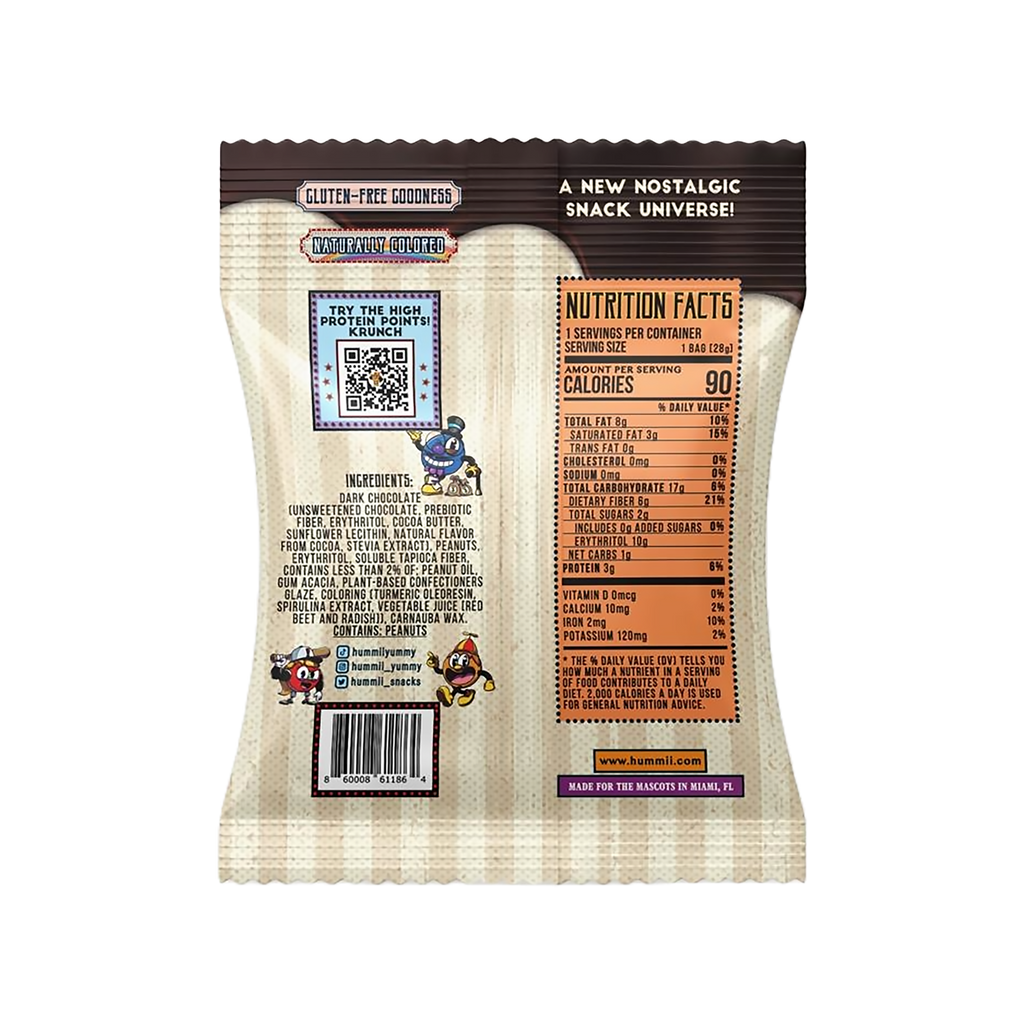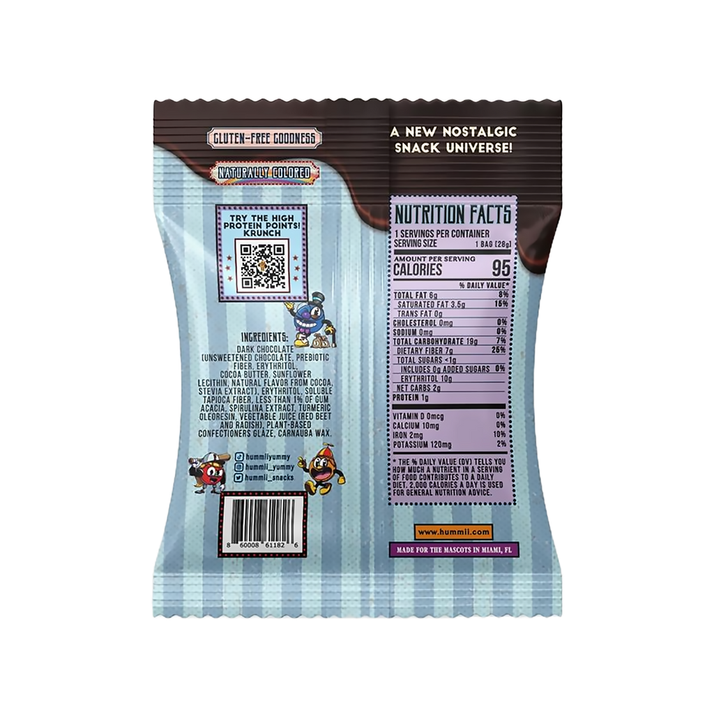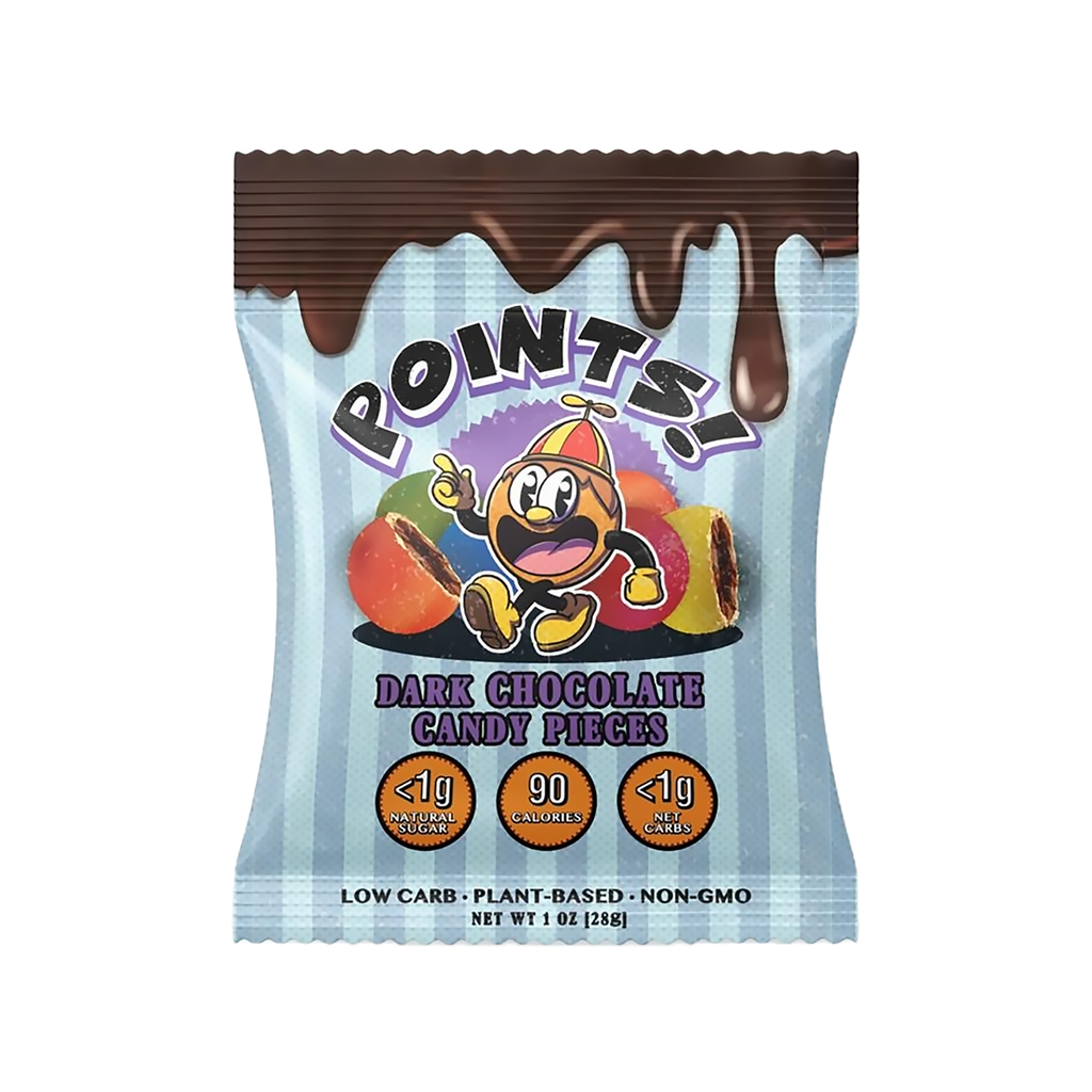 Ingredients: POINTS! Dark Chocolate [Unsweetened Chocolate, Prebiotic Fiber, Erythritol, Cocoa Butter, Sunflower Lecithin, Natural Flavor, Stevia Extract], Erythritol, Soluble Tapioca Fiber. Less Than 2% Of: Gum Acacia, Spirulina Extract, Turmeric Oleoresin, Vegetable Juice [Red Raddish & Beat Juice], Shellac, Carnauba Wax